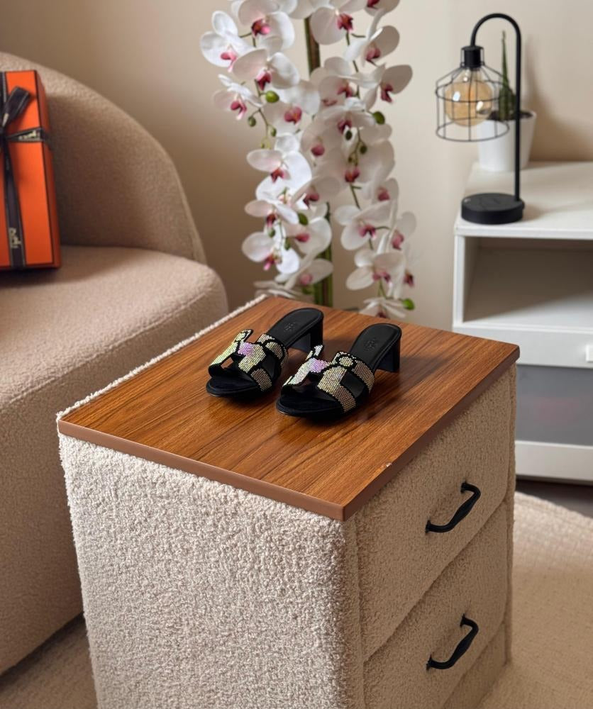 Designed with Hermès’ signature “H” cut-out and a comfortable block heel, they offer both sophistication and all-day comfort. Perfect for evening events, parties, or adding a statement finish to your casual look.